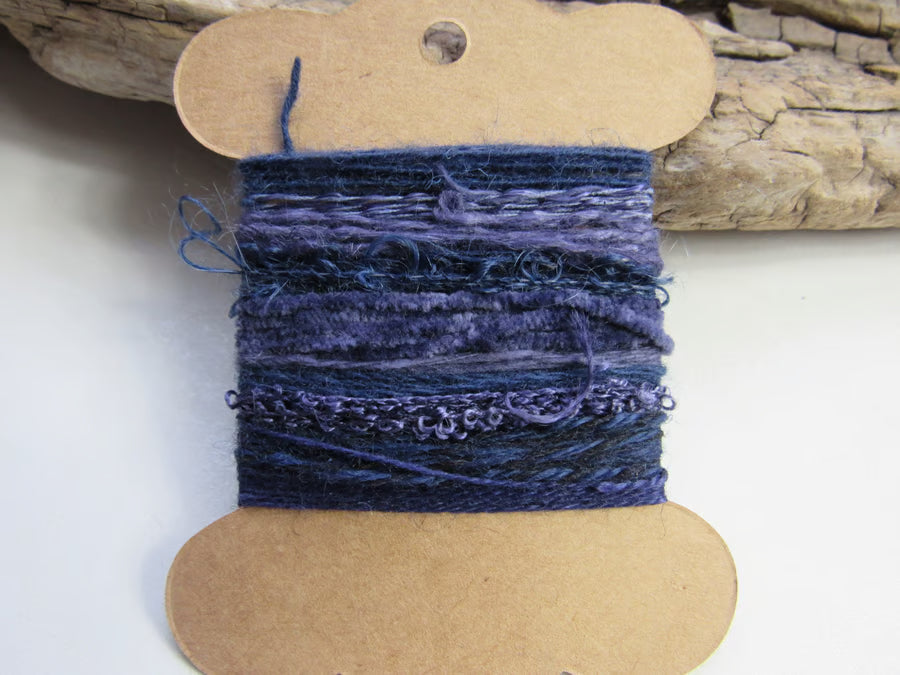 A mix of wools, viscose and cotton. Some are pure and some are blends. The wonderful thing about a mix like this is that the different materials pick up the dye differently, giving a variety of shades as well as textures.