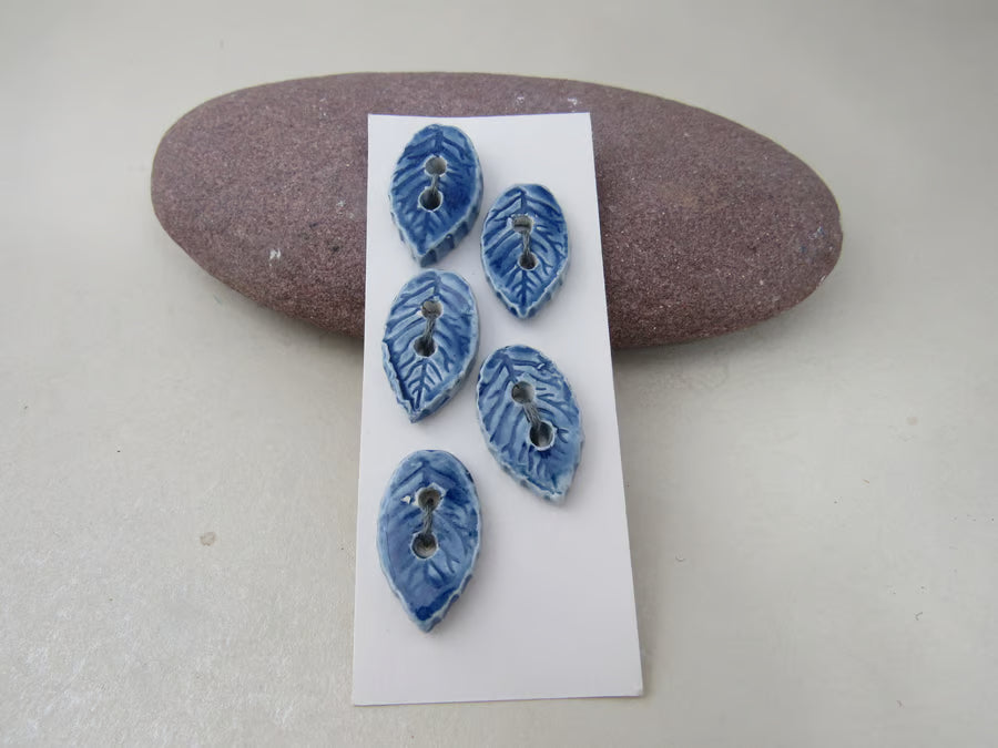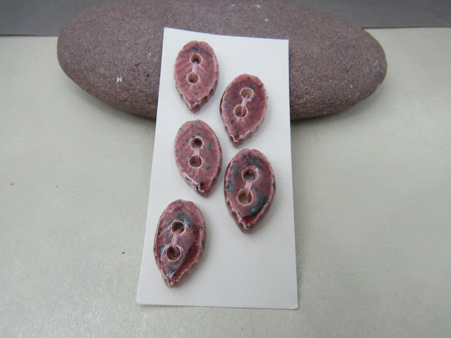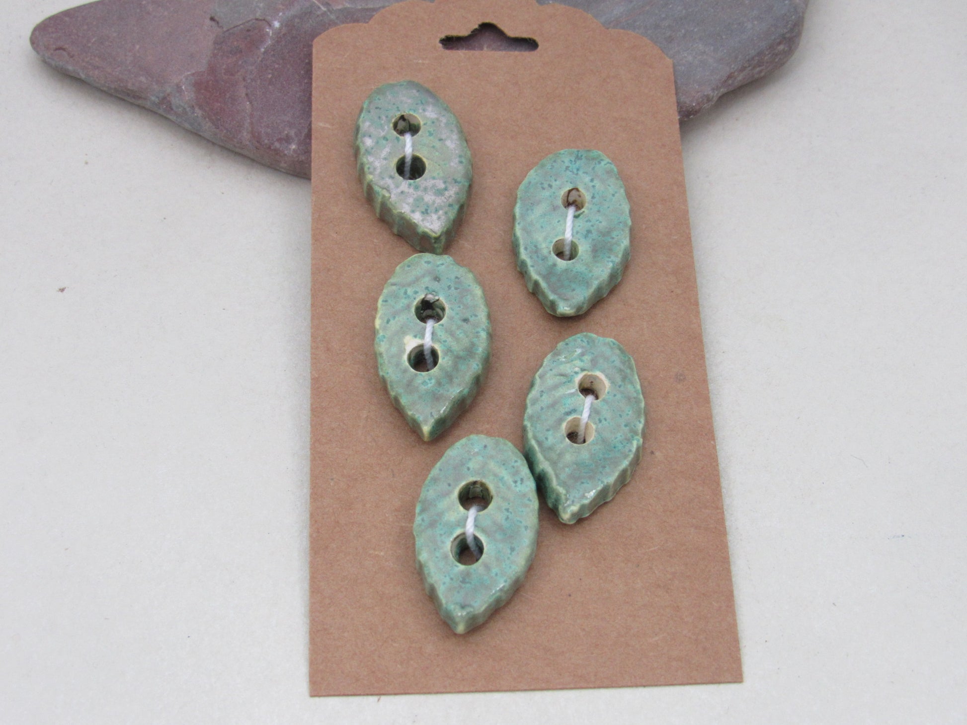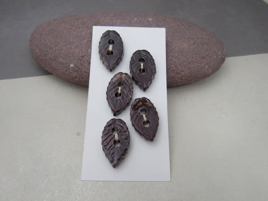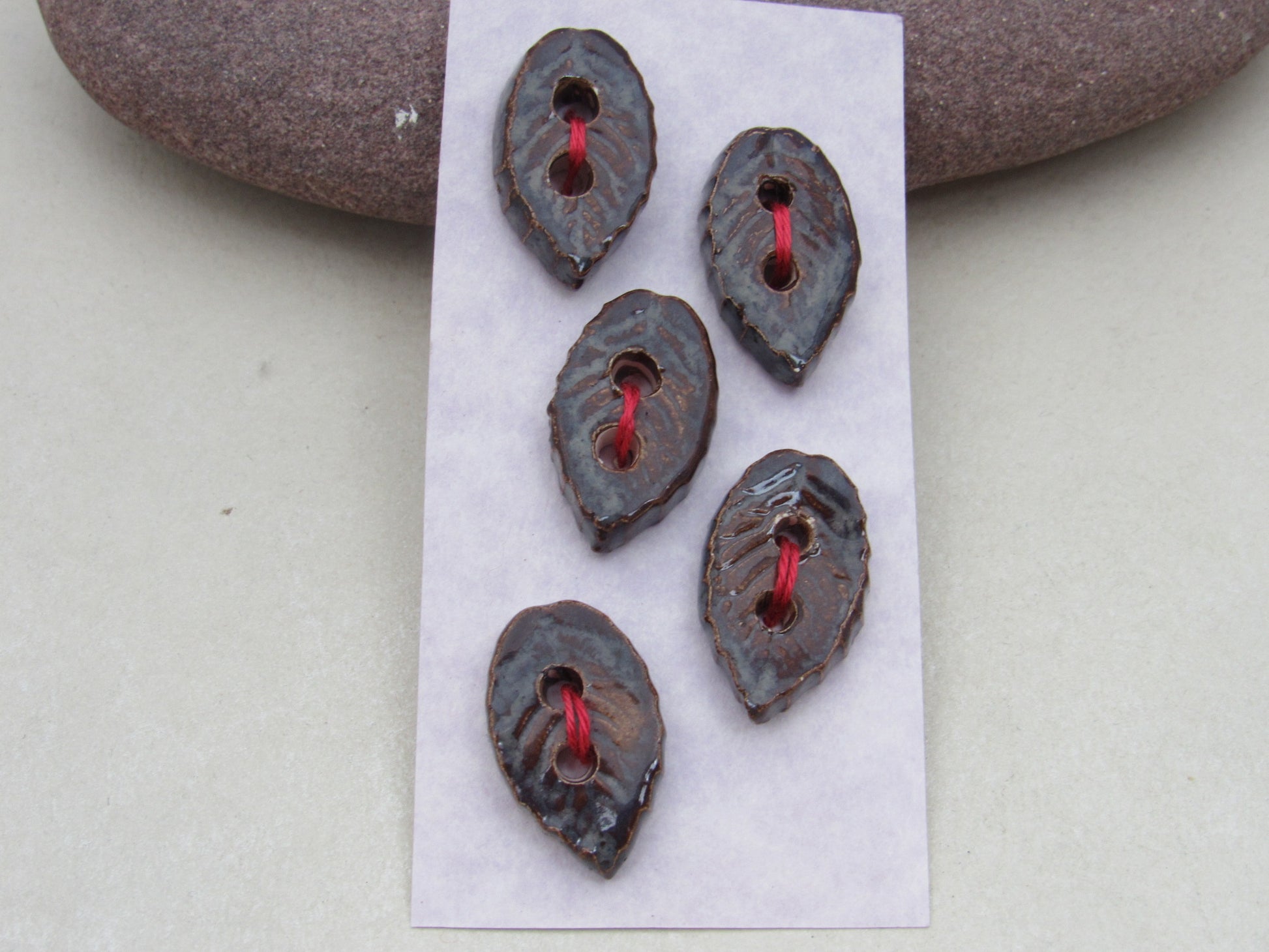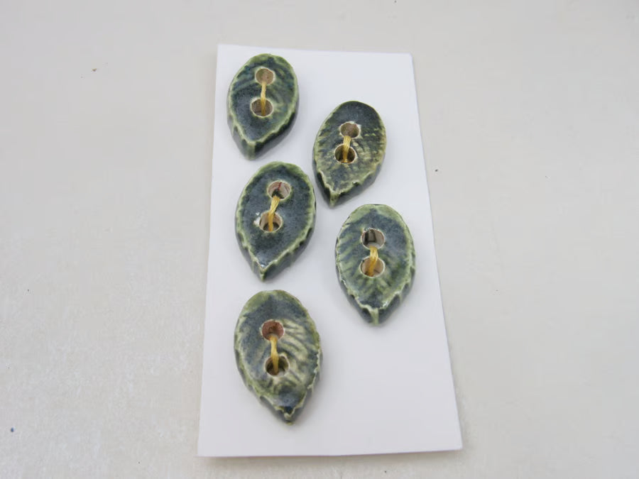 5 small stoneware buttons cut to a toothed leaf shape and finished with a variety of lead-free glazes