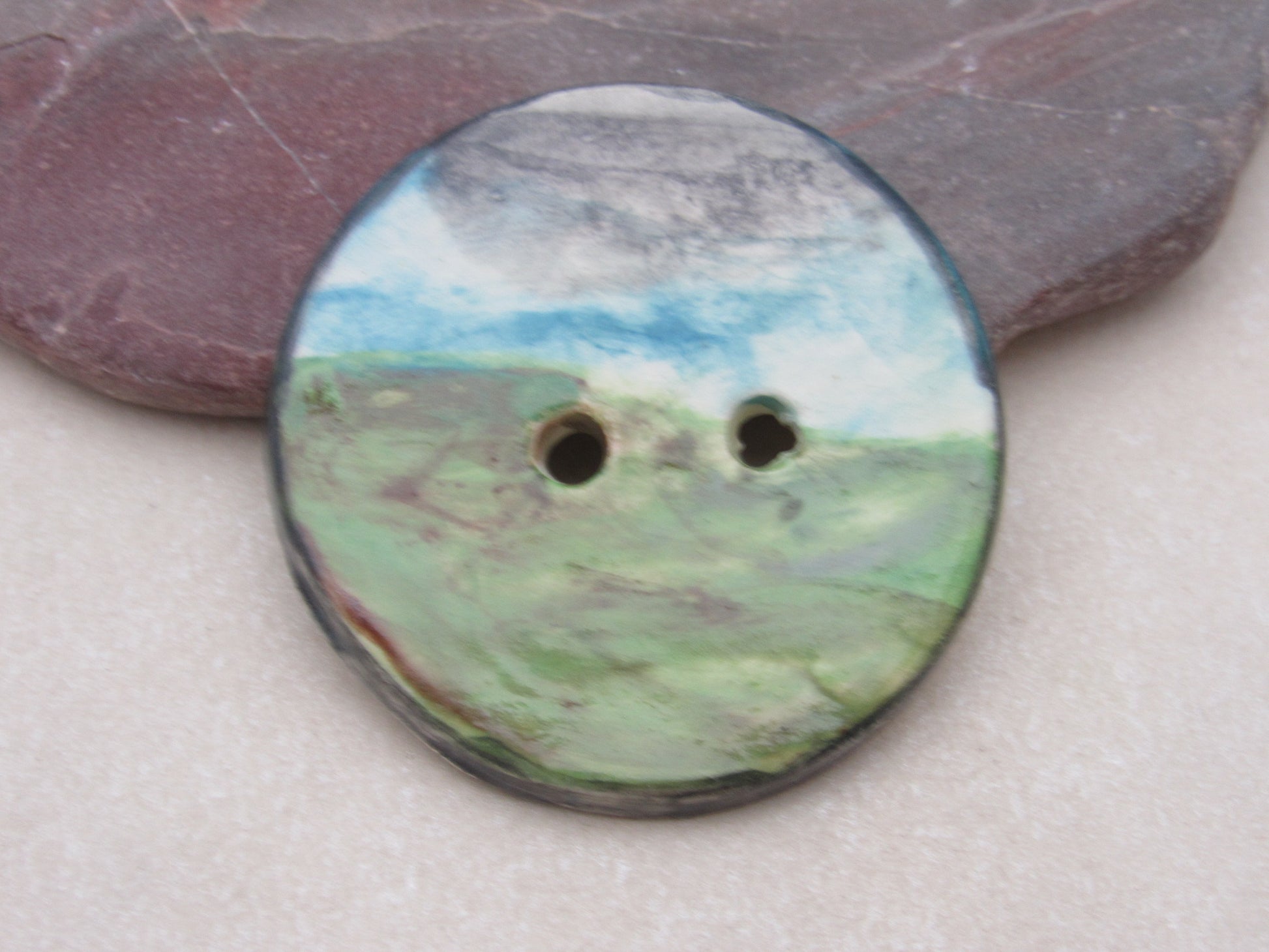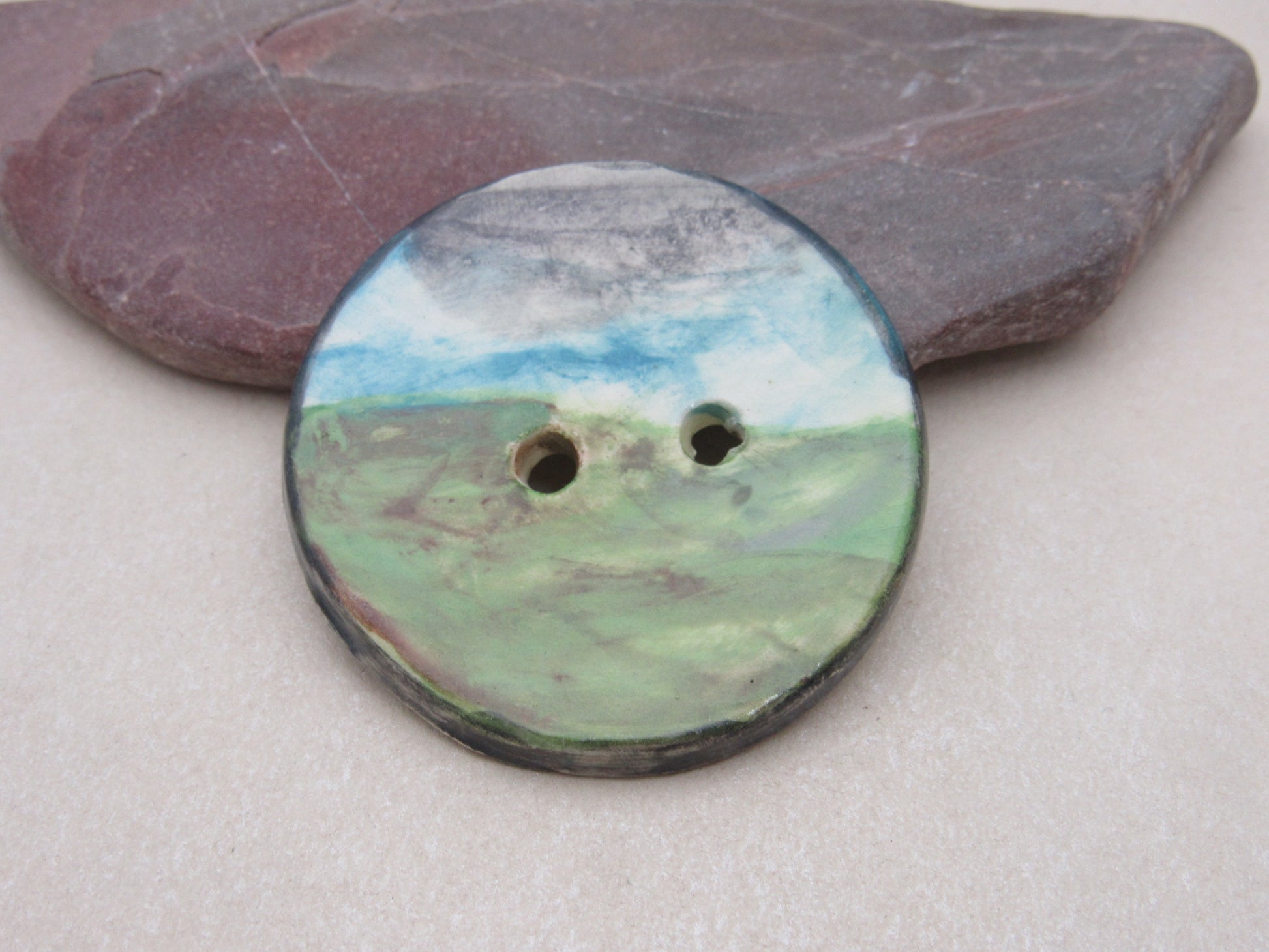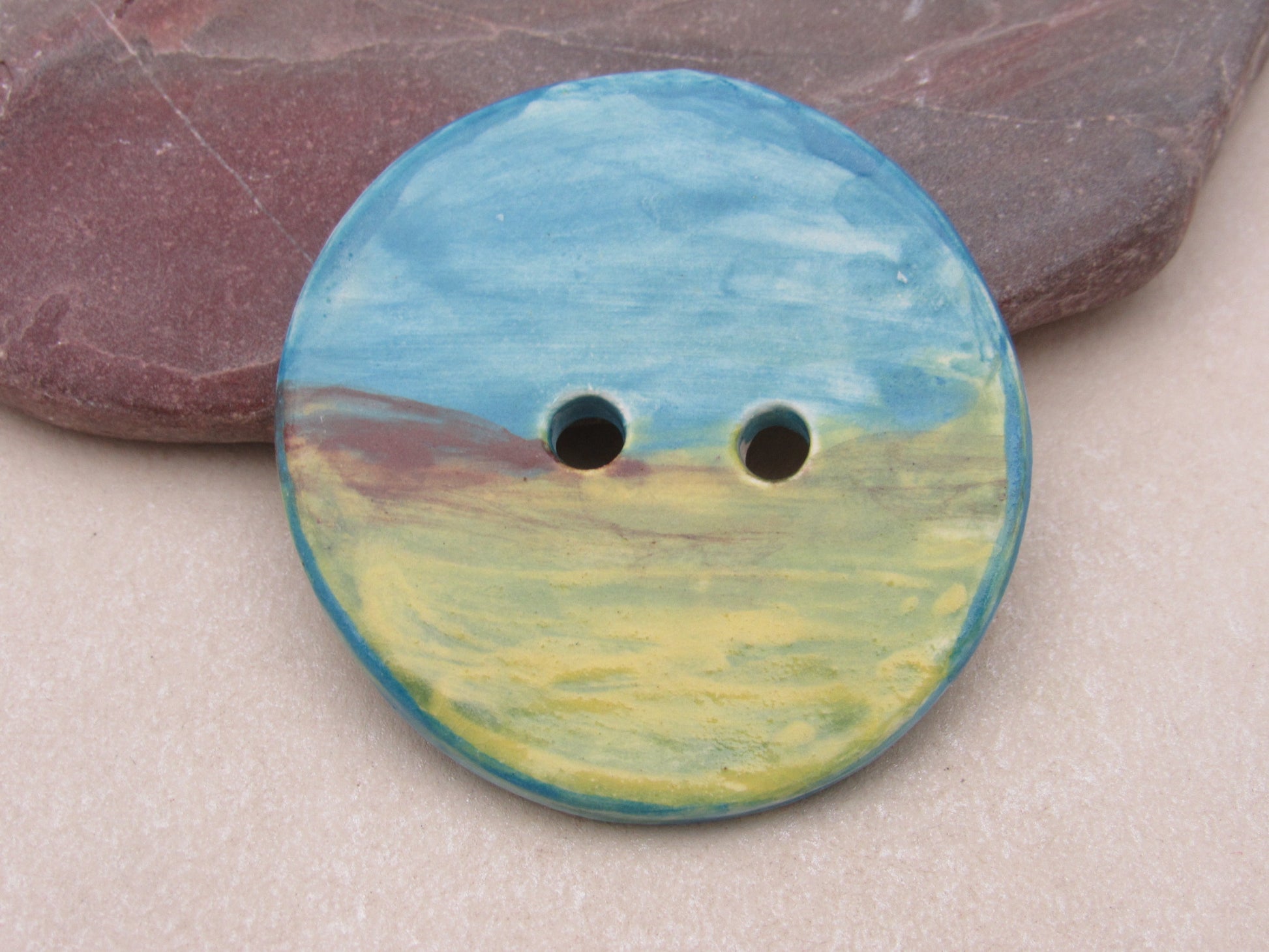 Large stoneware button, handpainted with coloured slips to give an abstract landscape effect