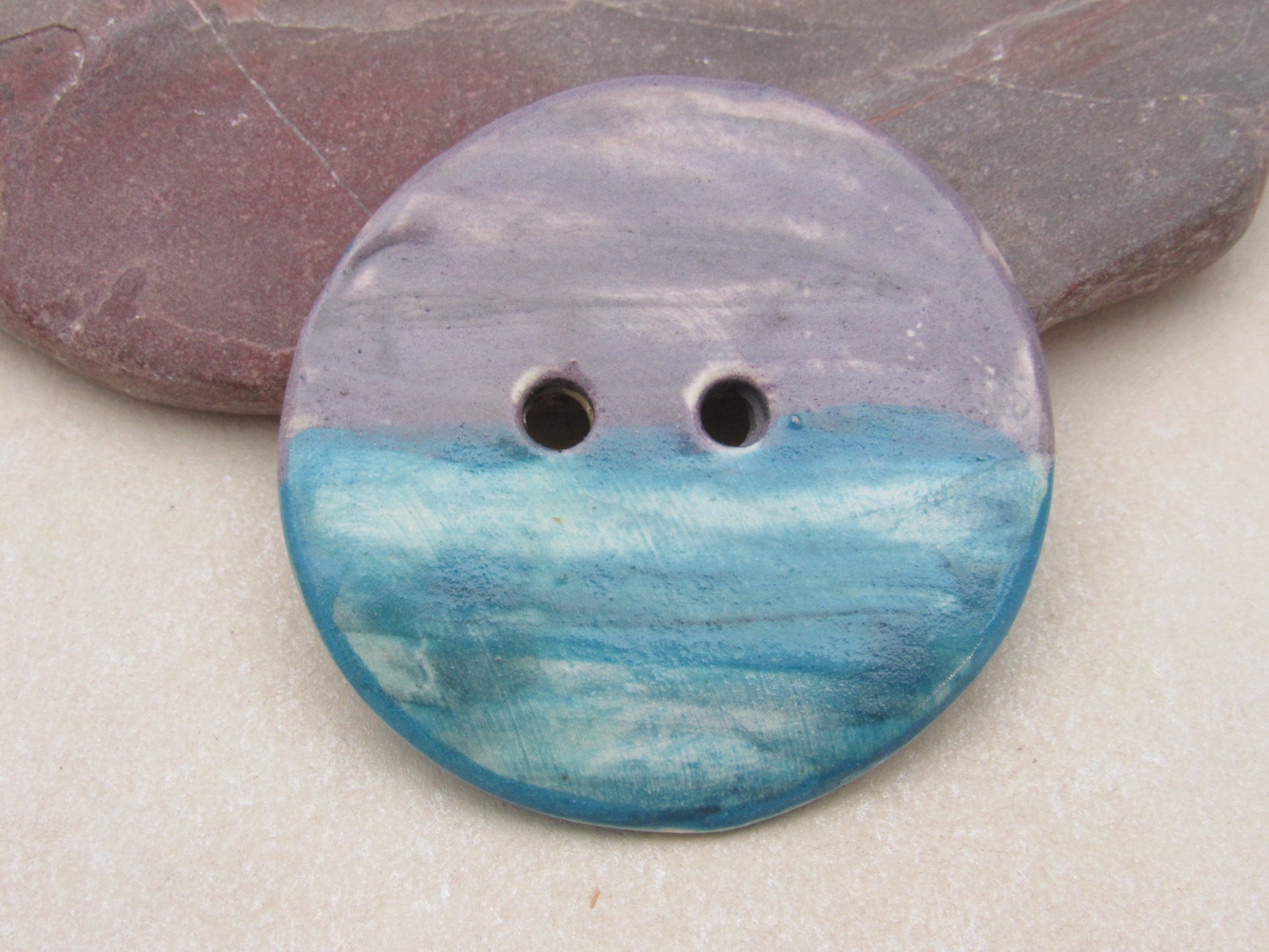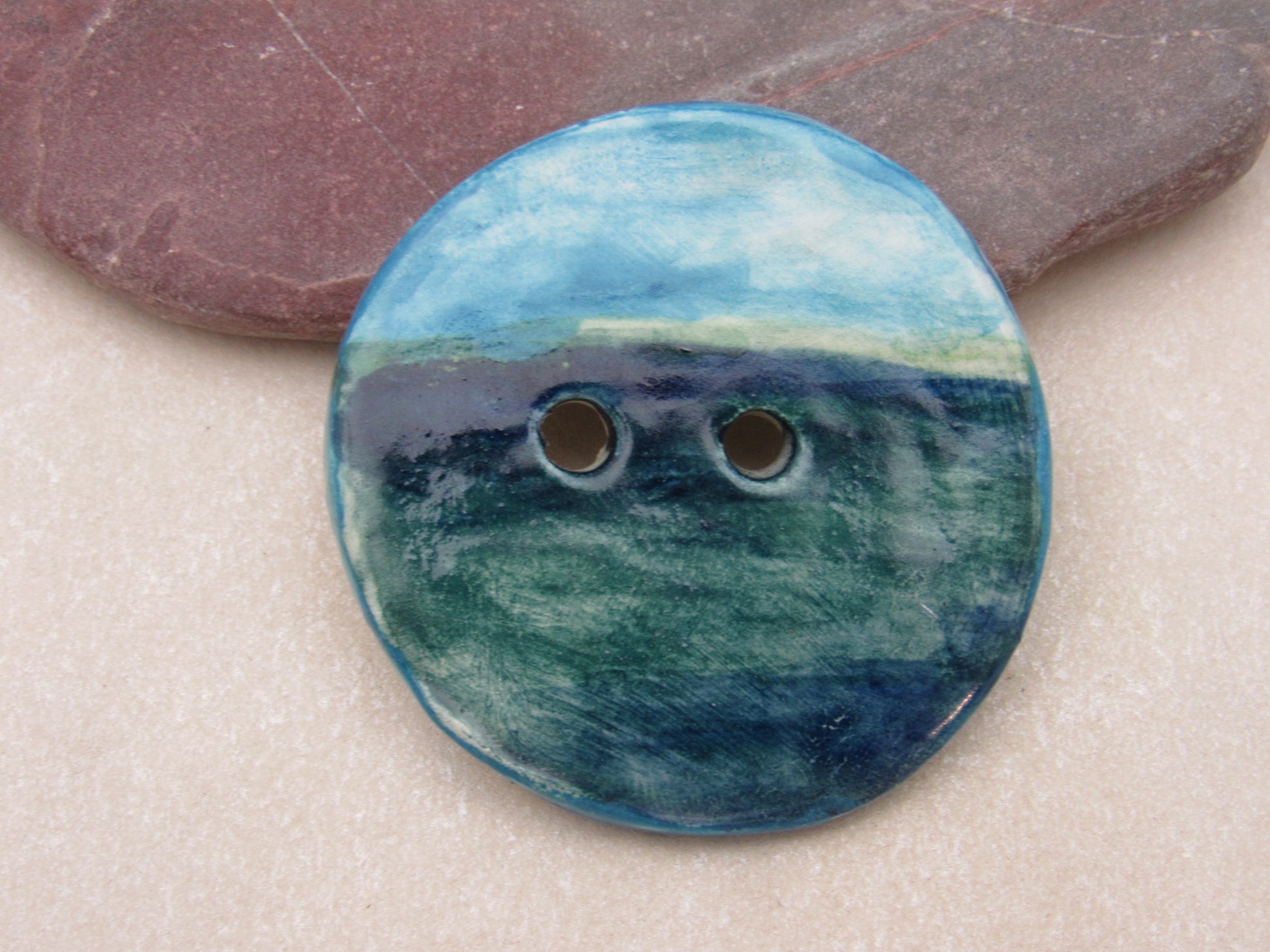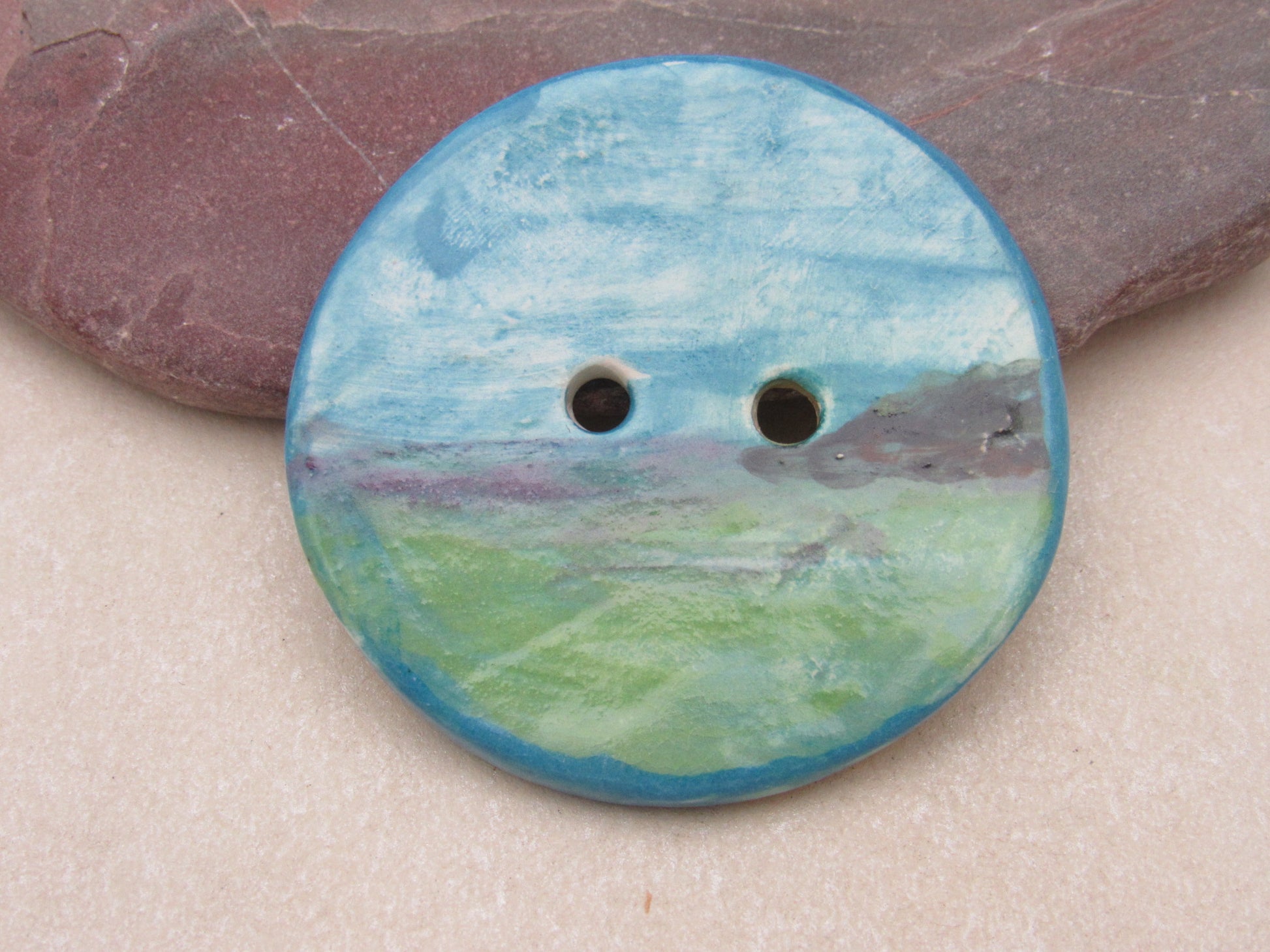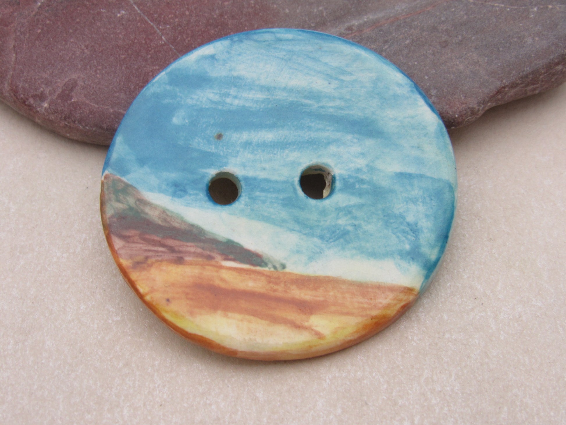 Large stoneware button, handpainted with coloured slips to give an abstract landscape effect