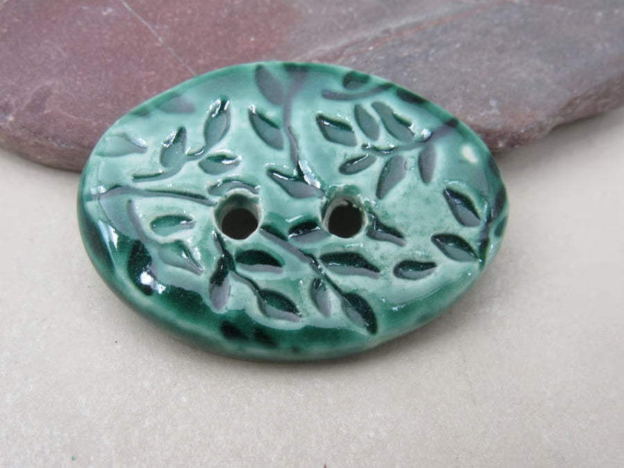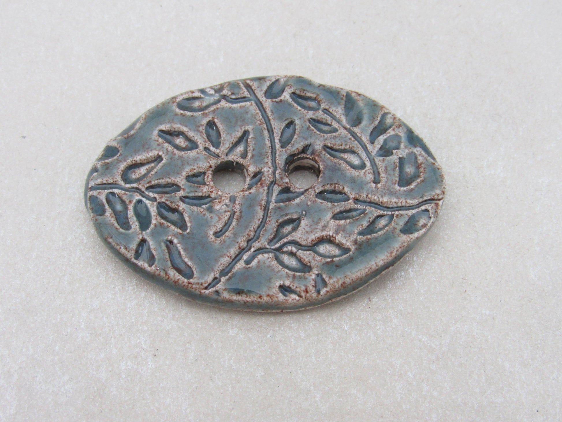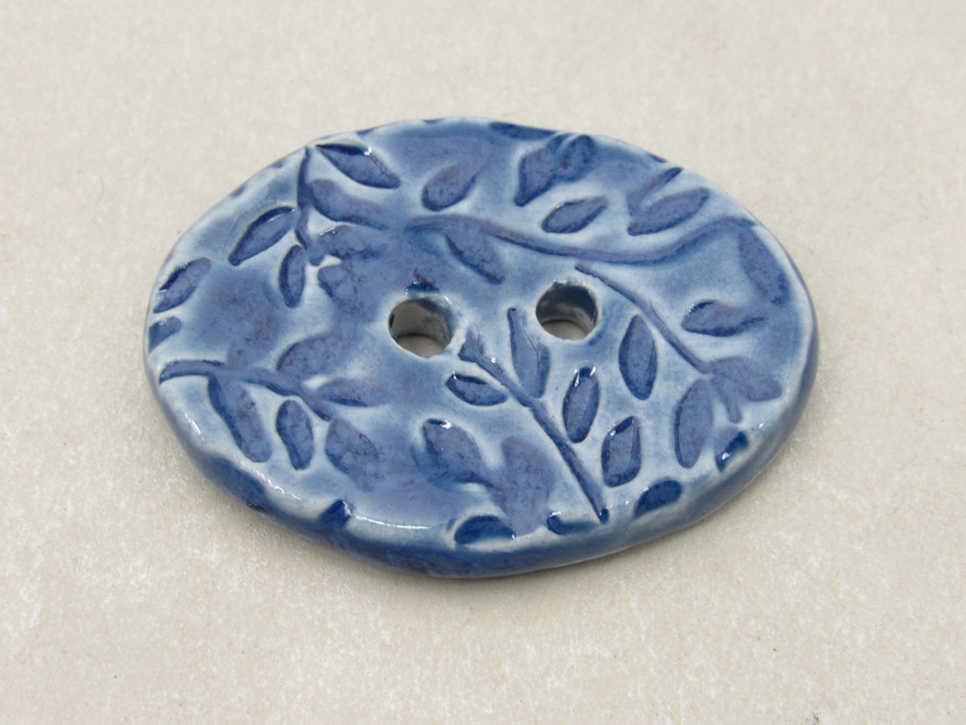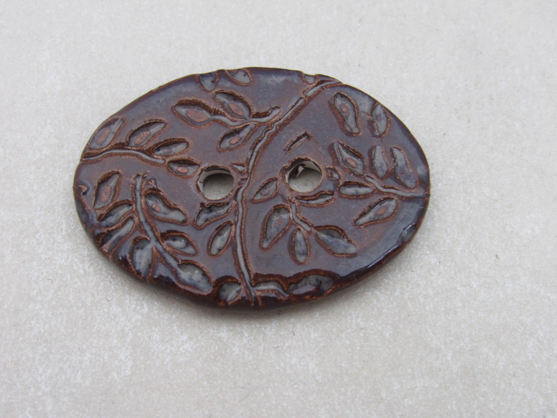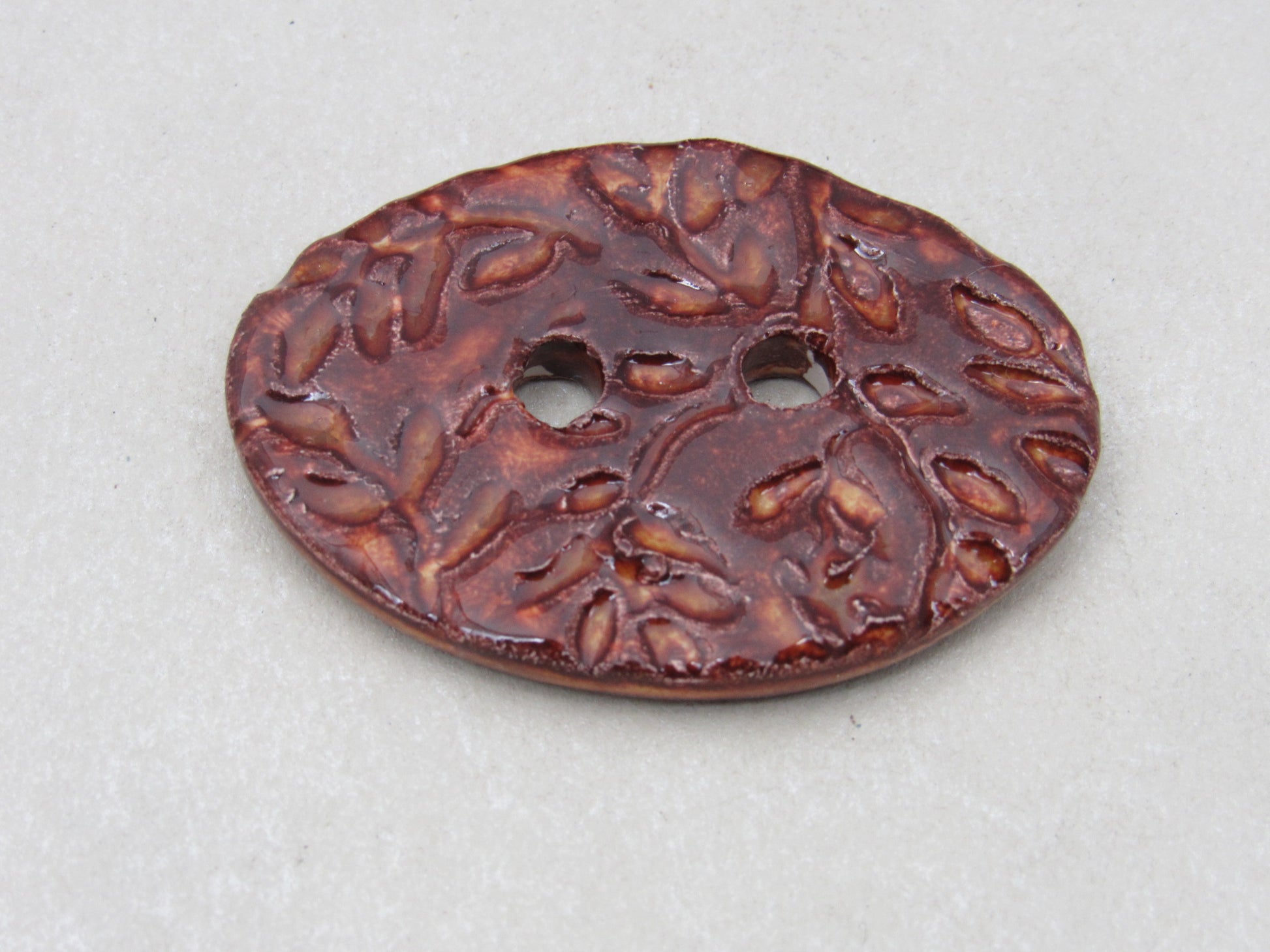 Medium oval shaped stoneware button, textured with a pretty motif of tiny leaves. Finished with a variety of lead-free glazes