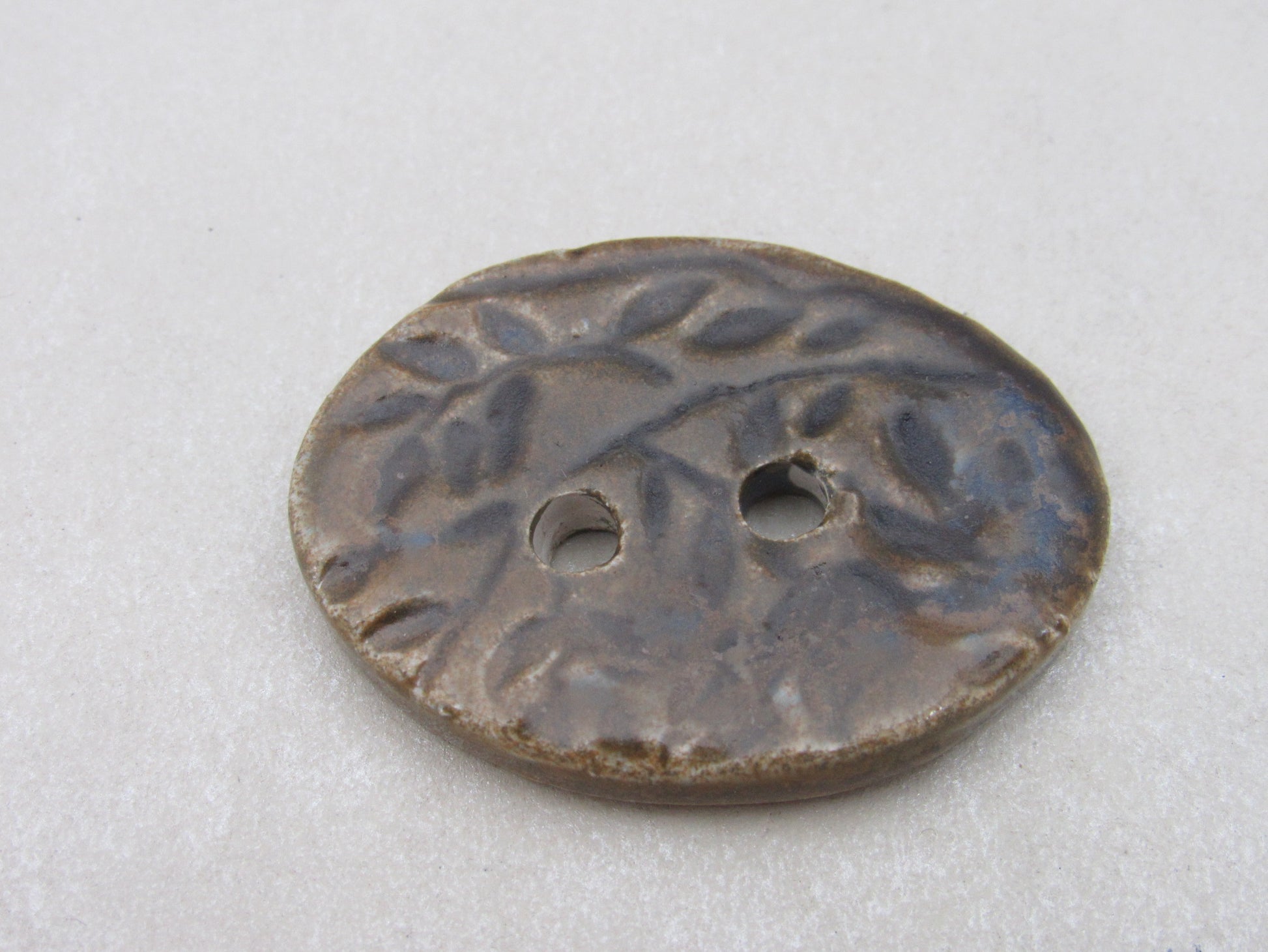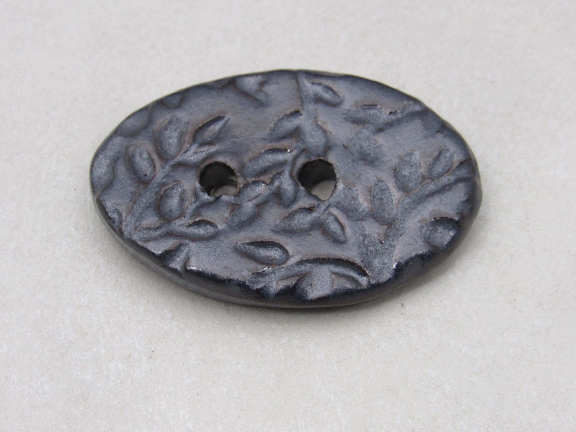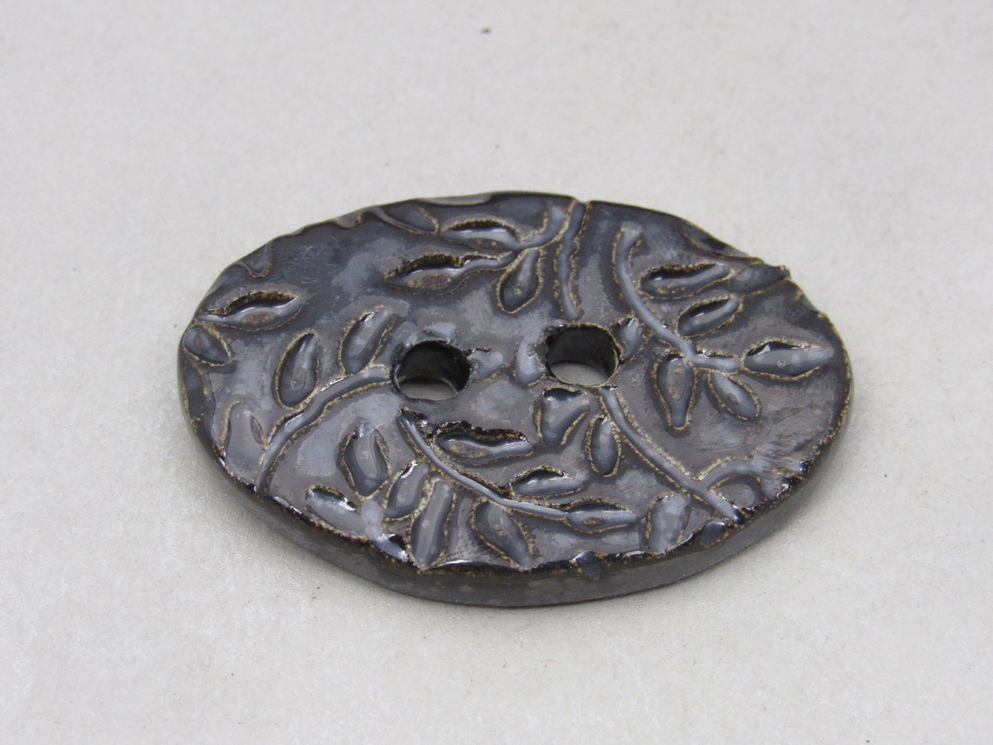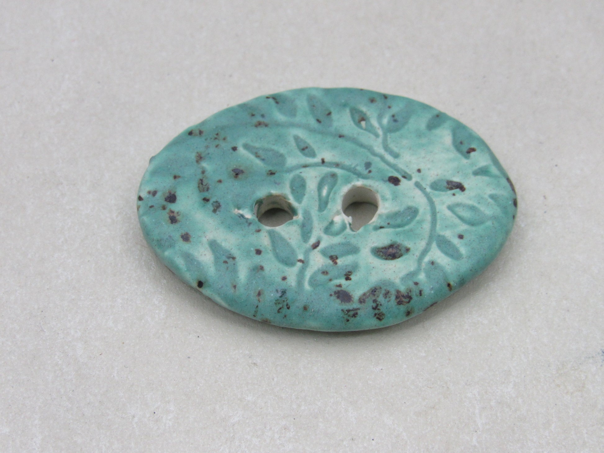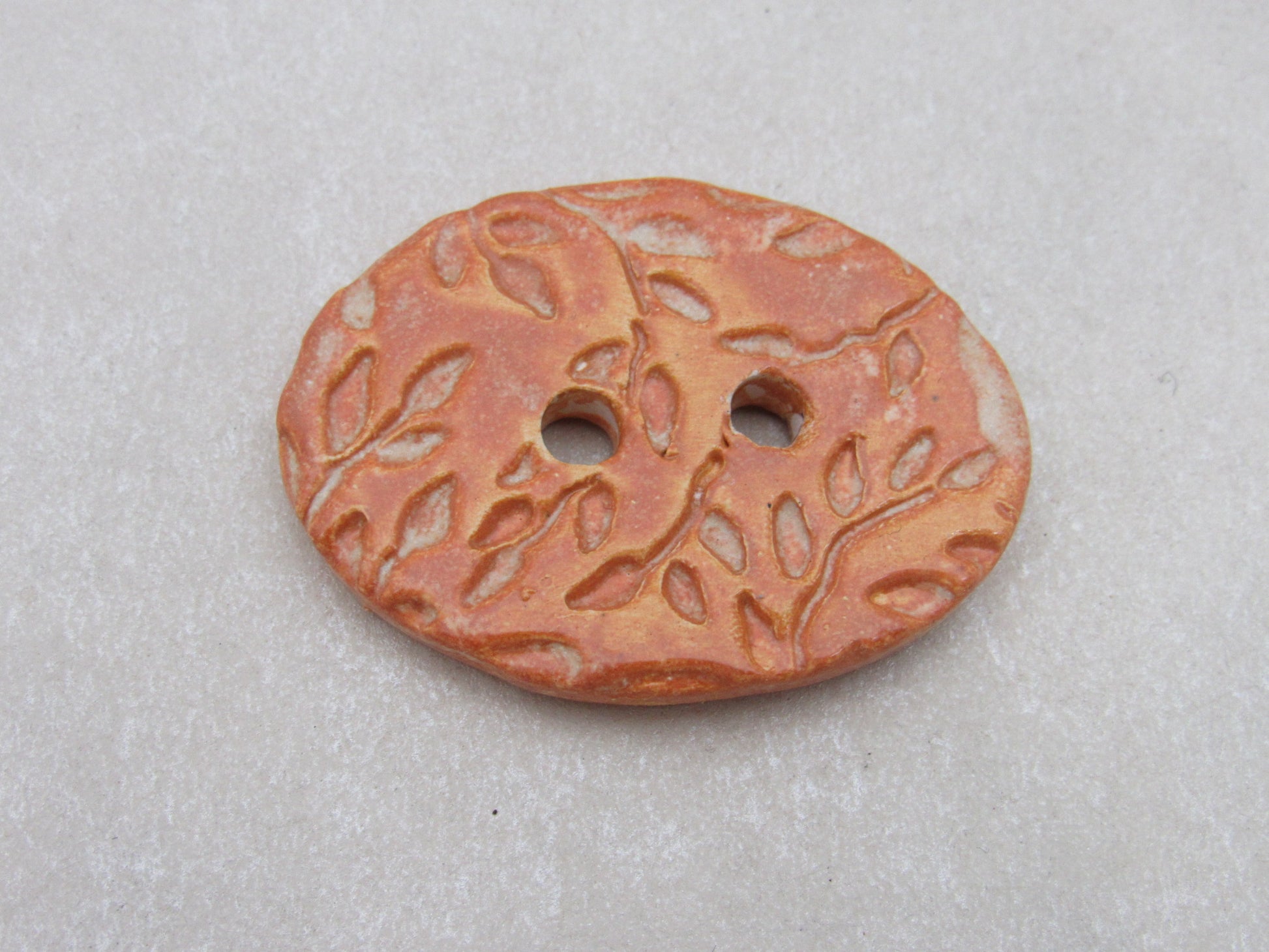 Medium oval shaped stoneware button, textured with a pretty motif of tiny leaves. Finished with a variety of lead-free glazes