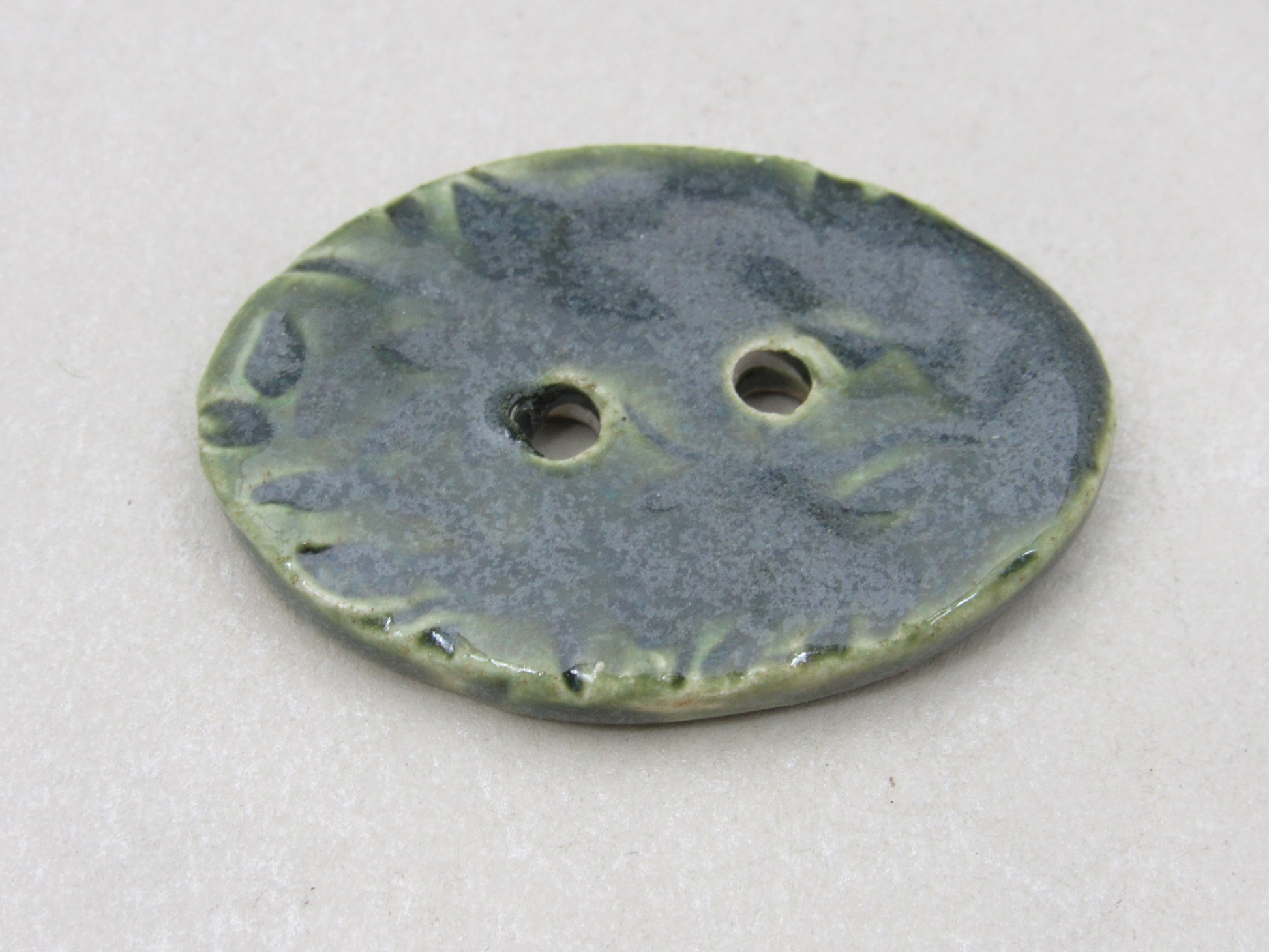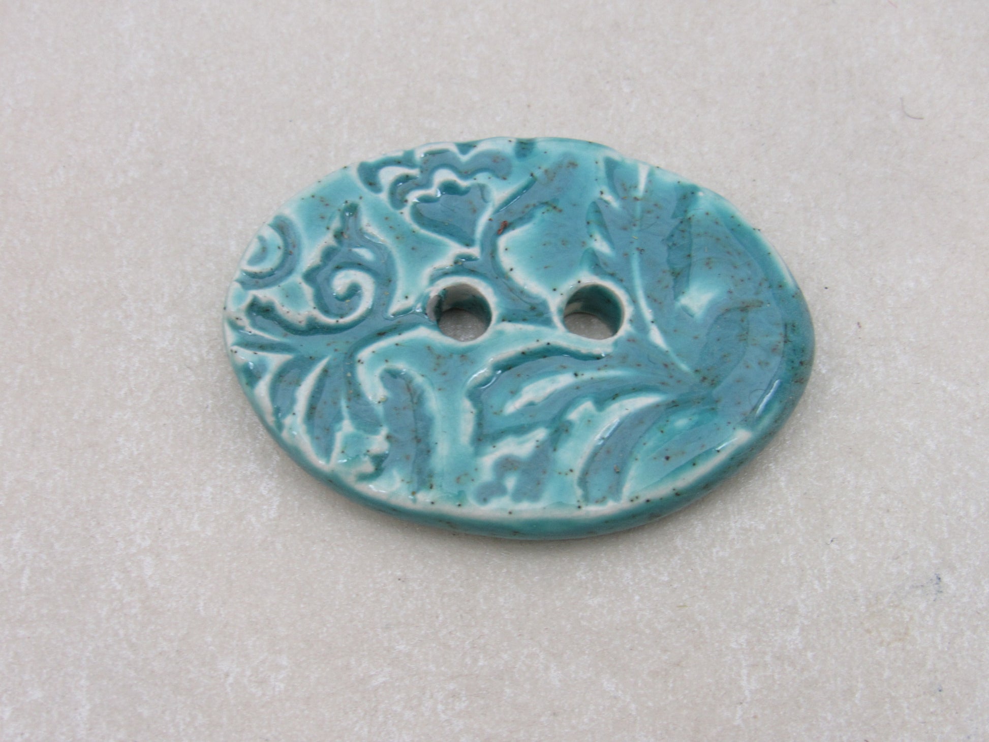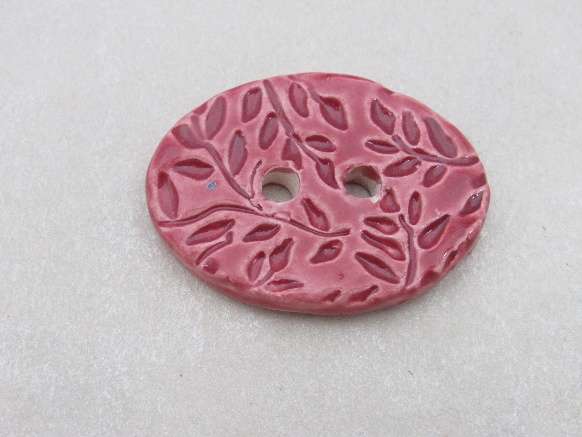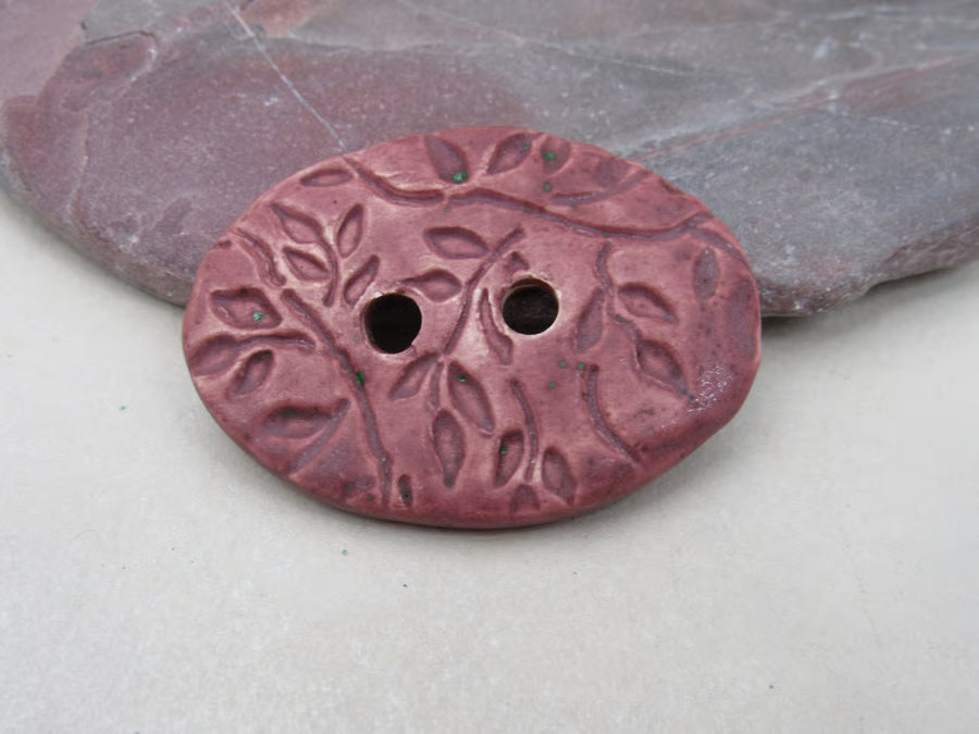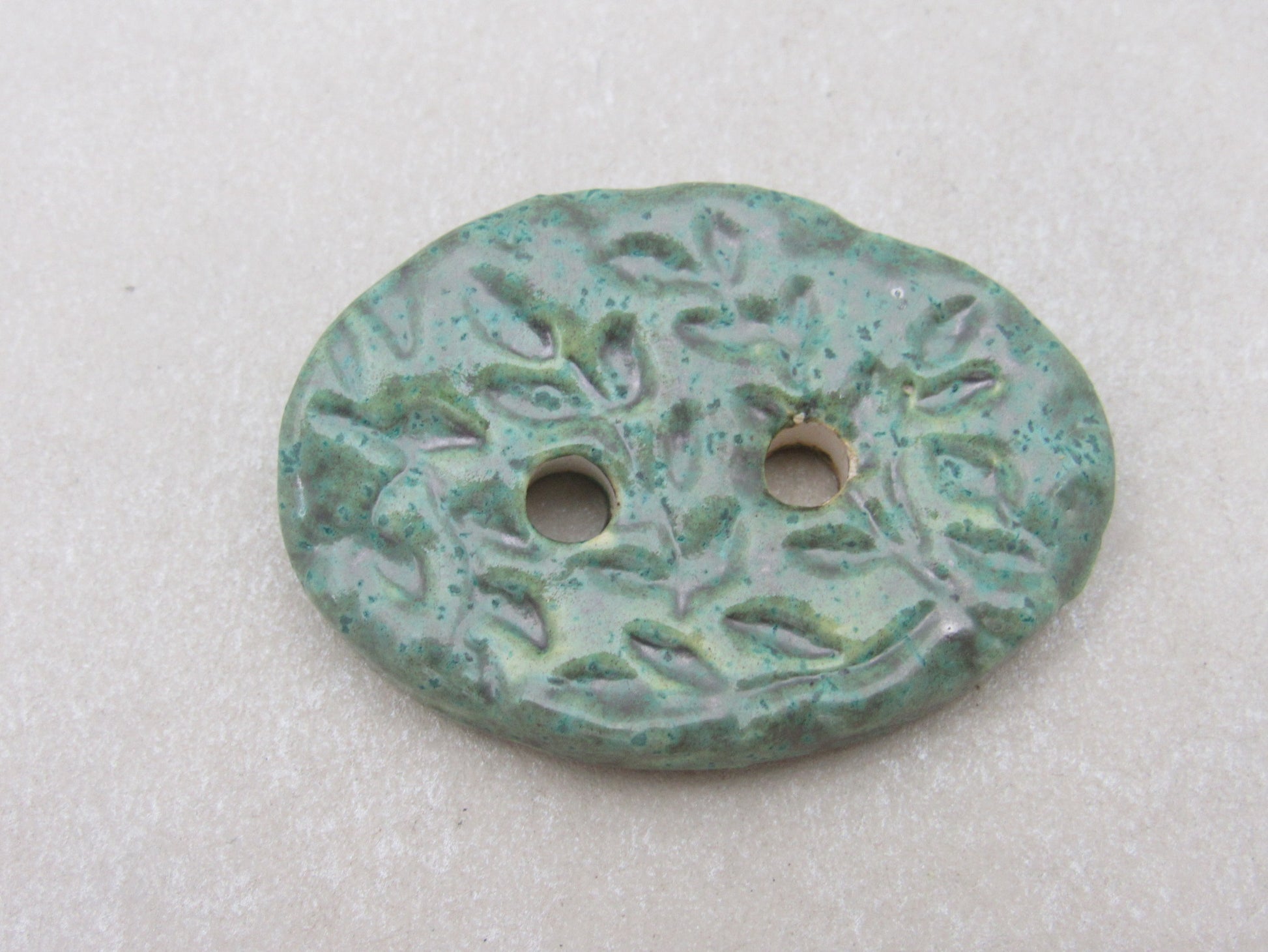 Medium oval shaped stoneware button, textured with a pretty motif of tiny leaves. Finished with a variety of lead-free glazes