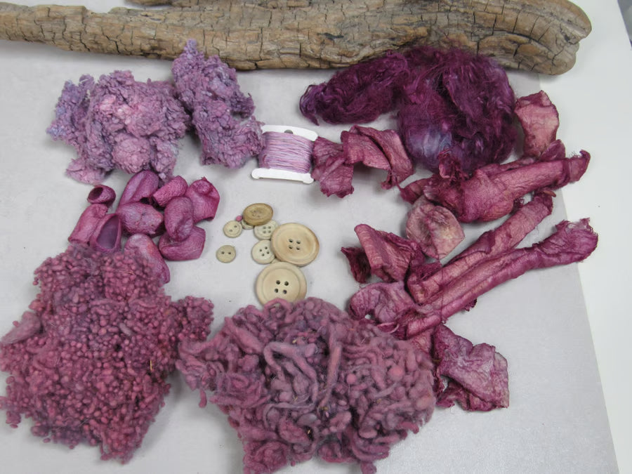 A collection of mixed natural fibres and textures, carefully dyed with natural dyes.