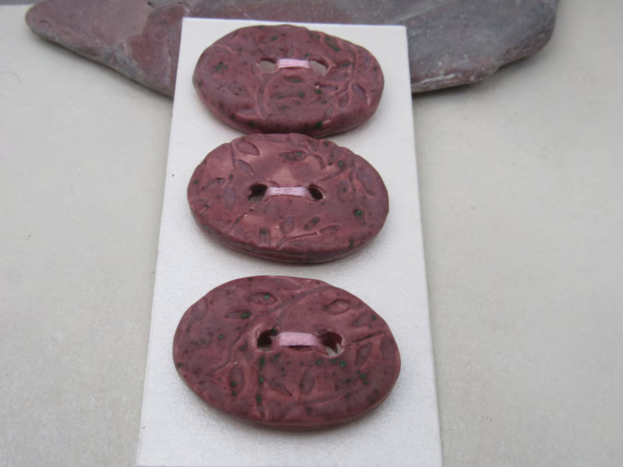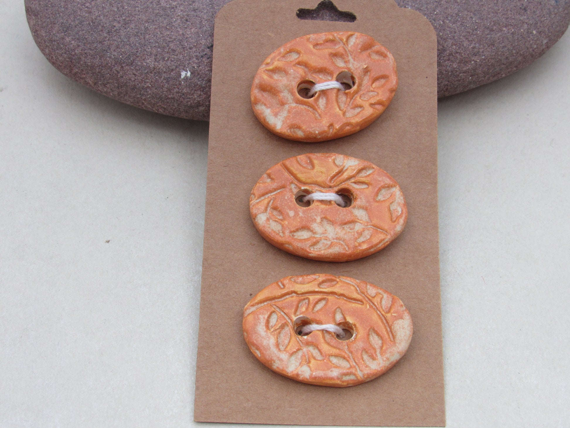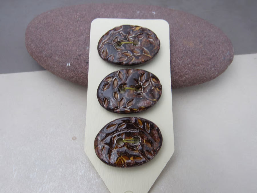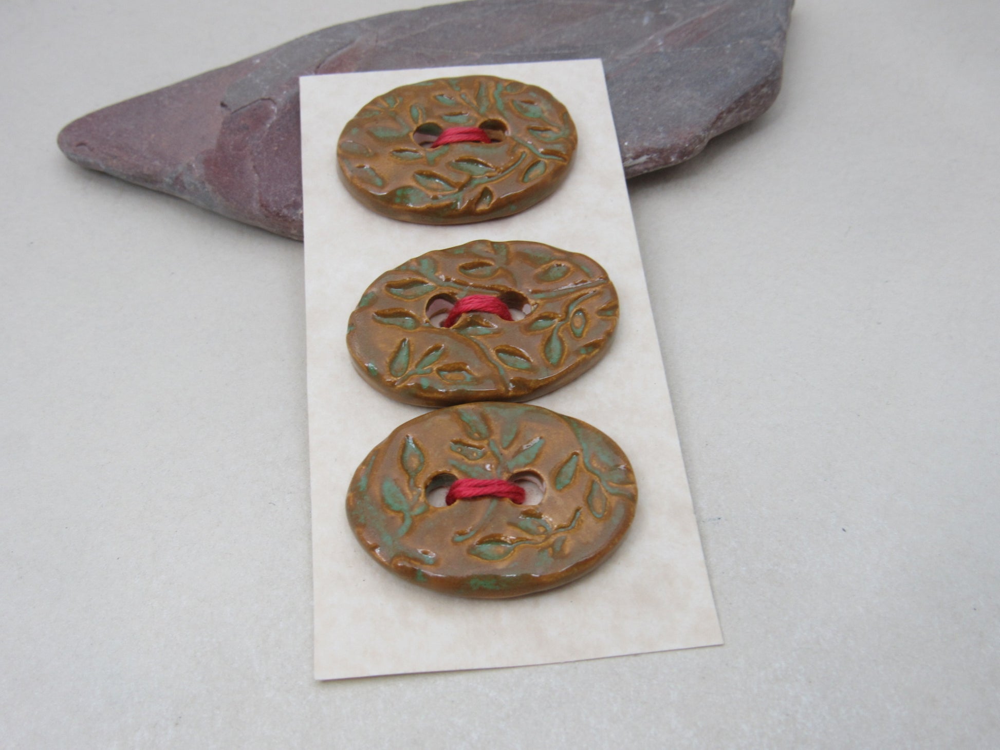 3 medium sized stoneware buttons, with a pretty leaf motif printed into the upper face.